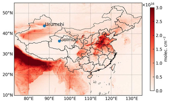 The city of Urumchi and Golmud are chosen for study for the following reasons: Firstly, NH3 total columns in Urumchi and Golmud are higher than those in the surrounding areas. Secondly, there are no large NH3 sources within 100 km radius of the two cities, so the interference from other sources is minimized. Figure 1 displays the locations of the two cities and the distributions of NH3 total column over China based on the dataset from the study of Van Damme et al. [13]. This dataset is taken from ANNI-NH3-v2.1R-I data, which are the oversampled data of IASI NH3 total columns for 9 years (2008–2016). The blue circles are the locations of Urumchi and Golmud.