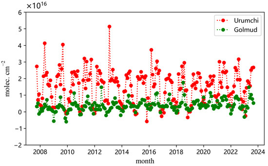 Monthly averages of NH3 total columns throughout the observation period from 2008 to 2023 in Urumchi and Golmud were also calculated, as shown in Figure 4. NH3 total columns show obvious seasonal variation in Urumchi, with high concentrations from March to October and low concentrations in winter, such as in January, February, November, and December. Monthly averages of NH3 total columns are about 2.0 × 1016 molec. cm−2 from March to October, and about 4.7 × 1015 molec. cm−2 in winter in Urumchi. NH3 total columns also show clear seasonal variation in Golmud, with high concentrations in summer and low concentrations in winter. The monthly average of NH3 total columns reaches its maximum in July in Golmud, with a value of 1.0 × 1016 molec. cm−2.