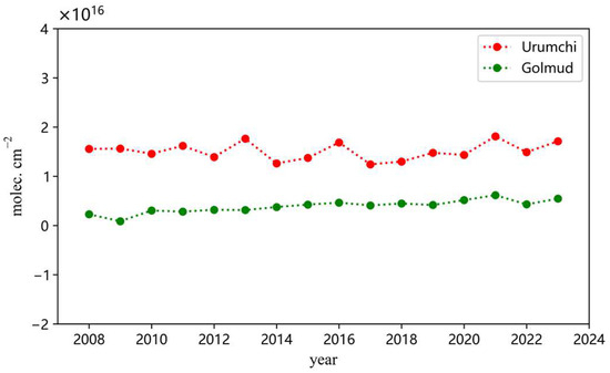 The monthly averages of NH3 total column in Urumchi and Golmud during from 2008 to 2023 were calculated based on IASI data, as shown in Figure 2. It can be seen that most NH3 total columns in Urumchi were higher than those in Golmud. So the annual averages of NH3 total columns in Urumchi are higher than the corresponding values in Golmud in Figure 3. Also, the annual averages of NH3 total columns in Urumchi show high levels in 2013, 2016, and 2021, with the value of 1.8 × 1016, 1.7 × 1016, and 1.8 × 1016 molec. cm−2, respectively. However, the variation of annual average of NH3 columns in Golmud shows a different pattern, with a slowly increasing trend and no peaks in different years.
