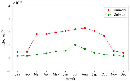 Variation of monthly average of NH3 total columns in Urumchi and Golmud.
