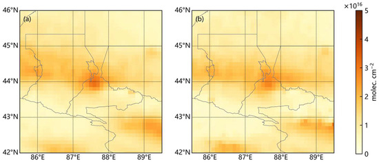 Mean NH3 columns around Urumchi under (a) calm and (b) west wind conditions.
