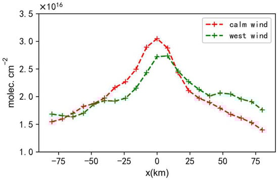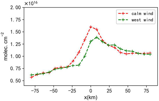 Figure 7 shows NH3 line densities under calm wind (red) and west wind (green) around Urumchi, and abscissa is the distance x to the center of Urumchi city. The maximum of the line density (red) appears in the center of the city under calm winds, and 8 km east of the city center under west wind conditions (green). The shift of the maximum of the two line densities under the two conditions reflects the spread range of the NH3 emission plume.