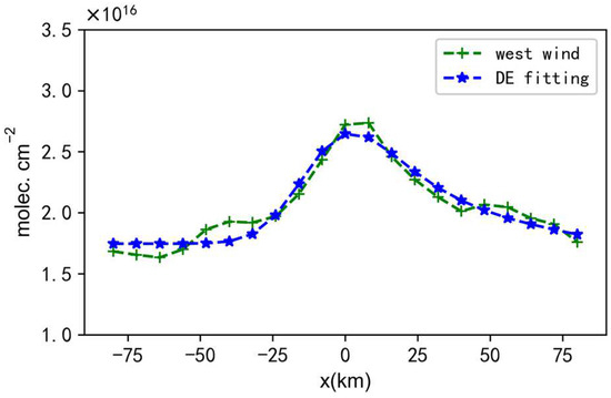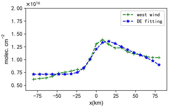 The fitted parameters by the DE algorithm are emissions E, background B, the e-folding distance x0, the fitted sources located in a polluted background relative to the Urumchi center X, and the standard deviation σ of the Gaussian function to describe the interference of different factors on the ideal distribution e(x). Figure 8 displays the fitted line density using the model function M(x) by the DE algorithm for the Urumchi area. The green line is the observed line density of ammonia under main wind direction, and the blue line is the fitted line density of ammonia.