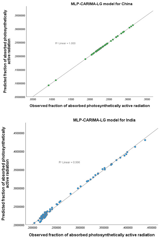 Table 7. These results offer valuable insights into the effectiveness and efficiency of this innovative approach in addressing complex forecasting challenges. The use of multi-layer perceptron (MLP) combined with the controlled autoregressive integrated moving average (CARIMA) model and the logistic probabilistic approach (LG) presents an innovative approach to forecasting the fraction of absorbed photosynthetically active radiation in China and India, as presented in