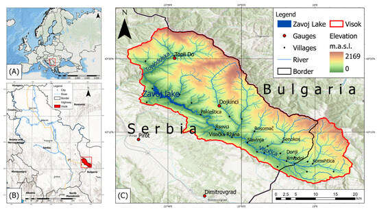 Geographical position of the Visok microregion. (A). Position of Serbia in Europe; (B). Position of the study area; (C). Main geographical features of the study area (Meteorological stations used in this study are represented by red dots on the (C) panel).