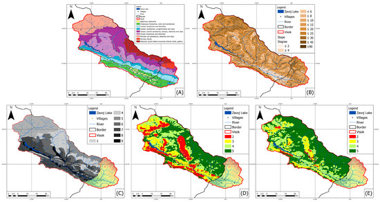 Thematic maps of the Visok microregion associated with soil erosion. (On panels (C–E), the Bulgarian part of the region was not included) (A). Geological map of (the Serbian part was digitalized using a basic geological map with a resolution of 1:100,000, while the Bulgarian part was digitalized using the map of the Carpatho–Balkanides with a 1:300,000 resolution [48]; (B). Slopes; (C). Soil permeability, according to the IntErO model [49]; (D). Erosion intensity during 1971 (Manojlović et al. (2018) [50], modified); (E). Erosion intensity during 2011 (Manojlović et al. (2018) [50], modified).