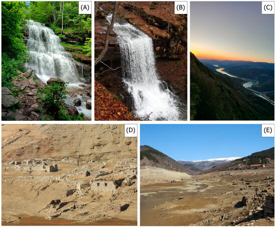 (A). Waterfall Tupavica; (B). Waterfall Skok; (C). Zavoj Lake from the viewpoint at Koziji kamen (D,E). The submerged village of Velika Lukanja, during the extremely low water level of Zavoj Lake. Photo by: Rastko Marković.