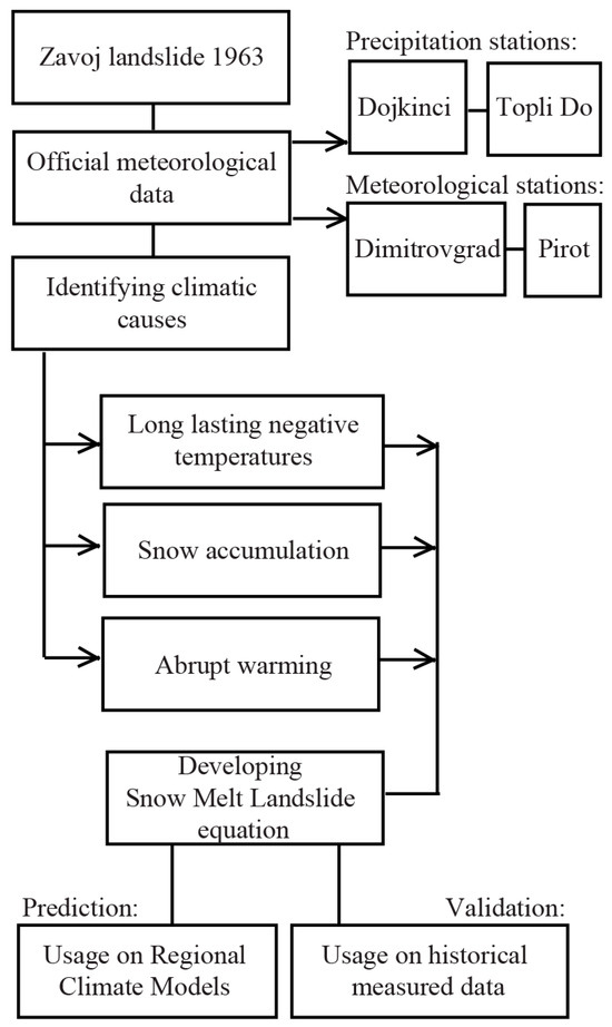 Landslides in Serbia represent a significant environmental and economic problem [36,37,38]. In urban areas, many landslides are influenced by anthropogenic activities [36], but they can also be triggered by extreme climatic events [39]. In our study, we investigated one of the most catastrophic landslide events in recent Serbian history. This landslide occurred in February 1963 in the Visočica River valley in Southeastern Serbia. Previous authors indicated that the main factor responsible for this event was snowmelt [40,41]. However, there exists no detailed quantification of the climatic conditions responsible for the landslide. Therefore, the goal of this paper is to devise an indicator of landslide probability using the Snow-Melt Landslide (SML) index based on existing climatological data. The index can be calculated for most areas of the world, requiring only basic meteorological data (monthly precipitation and average monthly maximum temperatures). In addition to predicting winter landslides, the SML index helps define critical points in snow accumulation before catastrophic landslides occur.