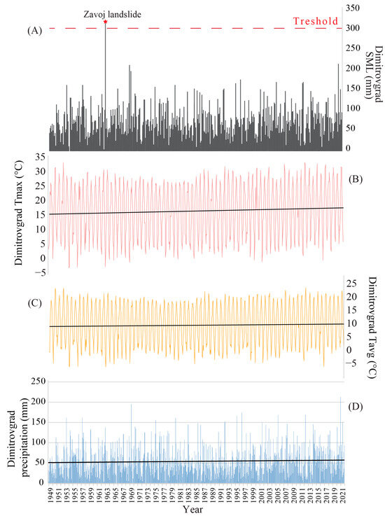 Data from the Dimitrovgrad meteorological station. (A). Precipitation data with the SML index applied; (B). Tmax data; (C). Tavg data; (D). Monthly precipitation values. Black lines represent linear trend curves estimated using ordinary least-squares regression.
