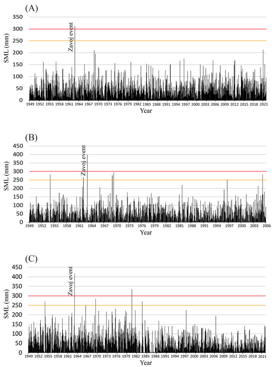 Precipitation data from the Dimitrovgrad, Topli Do, and Dojkinci gauges, with applied SML index based on the interpolated Dimitrovgrad Tmax to the average height of the basin. Defined thresholds of 300 mm (red line) and 250 mm (yellow line) are presented in Table 2. (A). Dimitrovgrad station precipitation data; (B). Topli Do station precipitation data; (C). Dojkinci station precipitation data. For the definition of the thresholds (red and yellow horizontal lines), see Table 2.