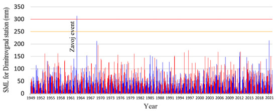 SML index values for the Dimitrovgrad station, showing summer (red) and winter (blue) monthly values. Defined thresholds of 300 mm (red line) and 250 mm (yellow line) are indicated.