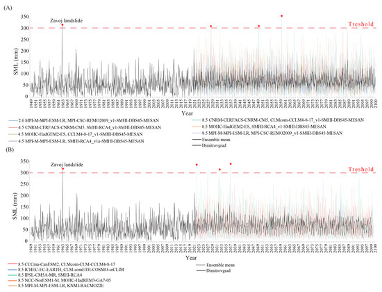 SML index data calculated using Dimitrovgrad station data. (A). Predictions based on bias-corrected RCM; (B). Predictions based on non-bias-corrected RCM. The SML threshold (300 mm) exceedances are indicated by a red asterisk.