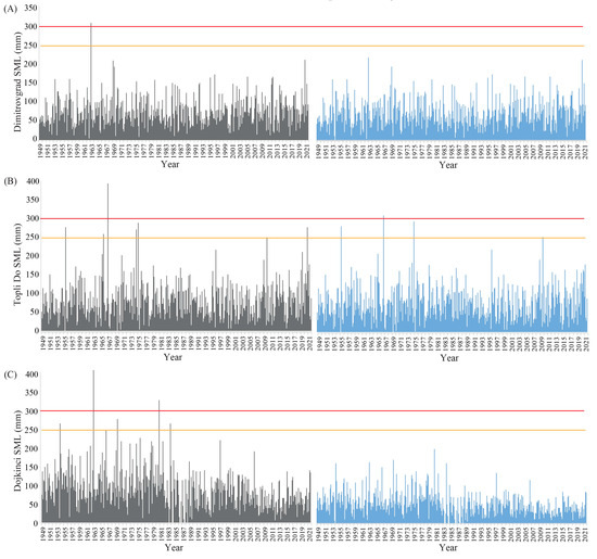 SML with interpolated Tmax (gray) and without interpolated Tmax (blue) for stations Dimitrovgrad (A), Topli Do (B), and Dojkinci (C). Defined thresholds of 300 mm (red line) and 250 mm (yellow line) are indicated on the panels.