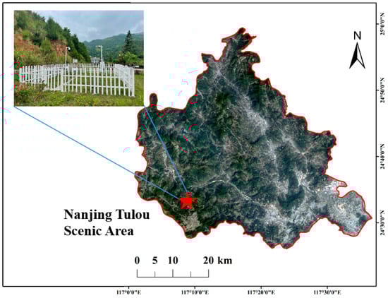The study site is located at the Nanjing Tulou Scenic Area (Nanjing County, Zhangzhou, China, 117°00′12″~117°36′36″ E, 24°26′20″~24°59′58″ N). The terrain slopes from northwest to southeast and includes four major topographic types: middle and low mountains, hills, plateaus, and river valley plains. Among these, hills are the predominant type, covering 44.1% of the land area, followed by middle and low mountains at 39.6% and river valley plains at 16.3%. The forest coverage rate is 73.41%, ranking the first in Zhangzhou City. The annual average temperature in Nanjing County is 21.5 °C, with a maximum temperature of 38.9 °C. Precipitation is abundant, with an average annual rainfall of 1738.8 mm and an average of 152 days per year with precipitation exceeding 0.1 mm [,].