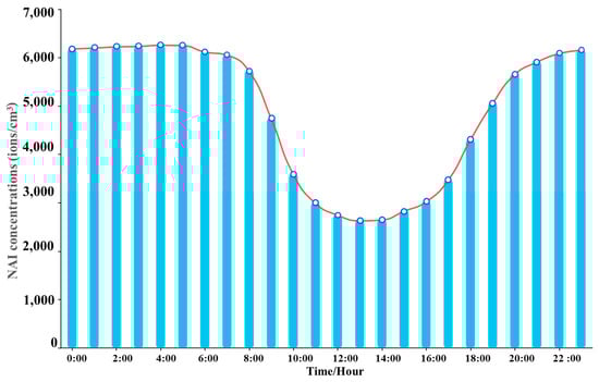 From 3 April 2020 to 26 May 2022, the daily variation of NAI concentrations exhibited a U-shaped curve with a daily average of 4827.54 ion/cm3 (Figure 3). NAI concentrations reached their first peak around 4:30 in the morning, with an average of 6302 ion/cm3. The second peak occurred around 10:45 at night, with an average of 6198 ion/cm3, while the minimum concentration was observed around 1:20 in the afternoon, with an average of 2671 ion/cm3.