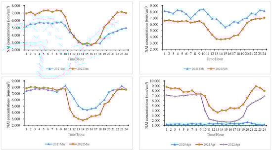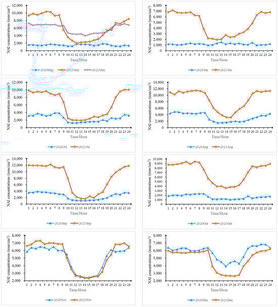 The daily dynamics of NAI concentrations during each month of the monitoring period showed relatively complex variations. In the daily dynamics for different months, a U-shaped distribution was mainly observed, with the greatest variation in daily average concentration in July 2021 and the smallest variation in April 2020 (Figure 4). There were 15 months with consistent trends in daily dynamics, accounting for 60% of the monitored months (Figure 4). During the 2020 monitoring period, different trends were mainly observed, with daily dynamics tending to be more stable overall. In general, NAI concentrations were typically highest in the morning (4:30–8:00) or evening (19:10–22:00) and lowest around noon (12:50–14:45).
