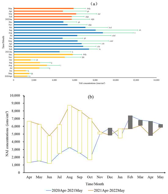 The monthly variation of NAI concentrations during the monitoring period were all above 1000 ion/cm3 (Figure 5a). The monthly dynamics from April to October exhibited significant differences in NAI concentrations across different years, while the monthly dynamics from October to the following May showed relatively minor variations (Figure 5b). Starting from November 2020 and continuing until the end of the monitoring period, the monthly NAI concentrations consistently exceeded 4000 ion/cm3, with an overall mean of 4931 ion/cm3. The highest monthly average concentrations occurred in August 2021 at 8726.16 ion/cm3, while the lowest concentration was 1183.76 ion/cm3 in June 2020.