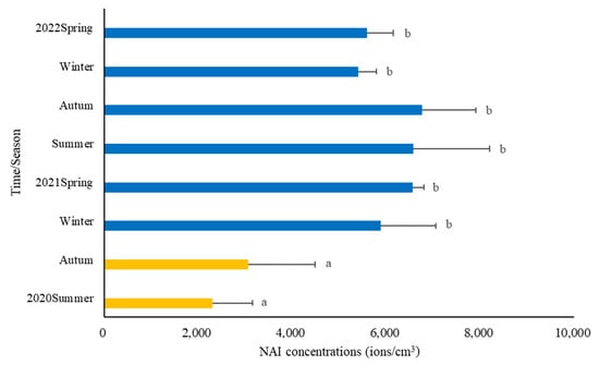 NAI concentrations in the winter of 2020 were significantly higher than those in the other seasons of the same year. The concentrations in the summer and autumn of 2021 were significantly higher than those in the same seasons in different years, with no significant differences observed in the spring and winter in 2021 (p > 0.05). During the monitoring period, the average NAI concentrations for each season from summer 2020 to spring 2022 were 2310.34 ion/cm3, 3070.73 ion/cm3, 5880.59 ion/cm3, 6568.63 ion/cm3, 6576.05 ion/cm3, 6768.53 ion/cm3, 5401.09 ion/cm3, and 5592.02 ion/cm3, respectively (Figure 6). The NAI concentrations during summer were 21.75% higher than those in winter. The monthly average concentrations in spring, autumn, and winter remained relatively stable in 2021.