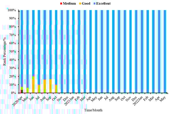 There were no instances of unfavorable NAI concentrations in any of the 26 months. In addition to the trends observed, a detailed breakdown of concentration levels can be found in Table S1 of Supplementary Material []. Starting from May 2020, NAI concentrations consistently maintained levels categorized as either favorable or outstanding, with the “intermediate” level observed only in April 2020 for a single day, showcasing a daily average NAI concentration of 670.08 ions/cm3 (Figure 7). Examining the seasonal patterns in 2020, the summer season demonstrated a favorable level of NAI concentrations, constituting 15.22% of the total. The autumn season exhibited a favorable level of 8.79%, while the winter season was characterized as outstanding. From 2021 to 2022, NAI concentrations in each month consistently reached an outstanding level (Figure 7).