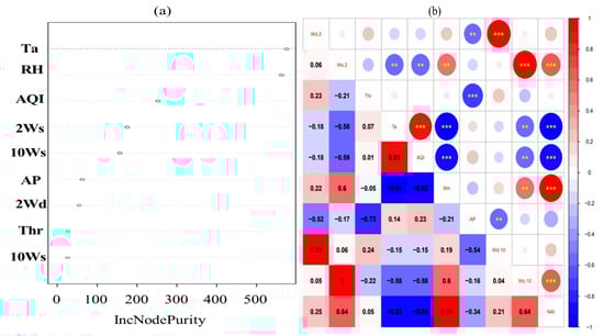 Important value (a) and correlation analysis (b) of different environmental factors. Note: IncNodePurity indicates the purity of nodes. The higher the purity of nodes, the greater the importance. Wd-2, Ws-2, Thr, Ta, AQI, RH, Wd-10, Ws-10, AP, and NAIs represent 2 min wind direction, 2 min wind speed, hourly rainfall, air temperature, air quality index, relative humidity, local air pressure and NAIs, respectively. Red means a positive correlation, and blue means a negative correlation. “**” and “***” are significant at the 0.05 and 0.01 level, respectively.