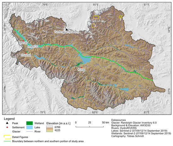 Covering an area of approximately 31,000 km2, the endorheic PTB is located in the transition zone between the eastern Trans-Himalayan and Karakoram ranges of Ladakh and the western parts of the Tibetan Plateau (Figure 1). The study area is bounded by the Chang Chenmo mountain ranges in the north and the Pangong Range as well as the Kailash Range in the south, all with elevations up to 6600 m a.s.l. Between these mountain ranges, there is a plateau with wide valleys and tectonic basins [38] characterized by lakes of different sizes. The largest saline lake is Pangong Tso, which covers an area of approximately 680 km2 at an elevation of 4225 m a.s.l. [39,40,41,42] (Figure 2). Pangong Tso and its tectonic continuation to the east divide the study area into a northern and a southern portion of almost equal sizes of 14,750 km2 and 16,484 km2, with mean elevations of 5083 m a.s.l. and 4912 m a.s.l., respectively.