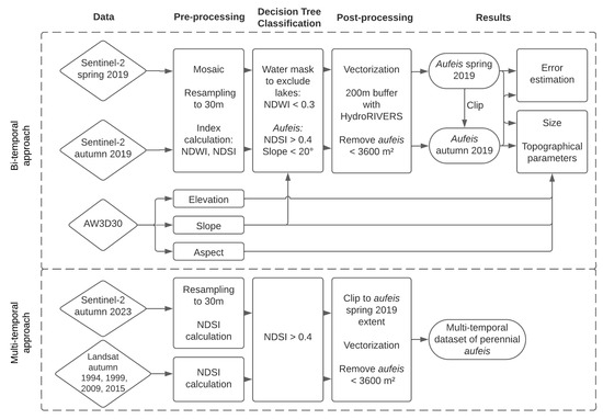 The Sentinel-2 tiles were mosaicked and resampled to a spatial resolution of 10 m for visual interpretation and to a spatial resolution of 30 m for comparative mapping purposes with other aufeis inventories using Landsat imagery [24,29,30,31,32,33,63] and to match the spatial resolution of the AW3D30. The mosaicked satellite images were classified using a decision tree approach, which is based on a series of binary decisions with predefined thresholds that assign each pixel to a distinct class (Figure 3). The advantage of this approach lies in the individual setting of thresholds and in its easy reproducibility. It is commonly used in aufeis detection [24,29,31,33] and glacier mapping [64,65,66,67].