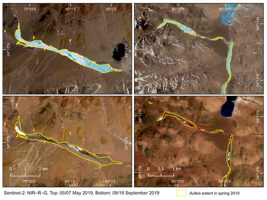 Cloud-free Sentinel-2 data from spring 2019 were applied for the aufeis inventory and from autumn 2019 for the identification of perennial aufeis fields in the study area. According to studies in the vicinity of the PTB [31,32], aufeis fields reach their maximum extent in May and can be easily separated from the surrounding snow- and ice-free land cover. The smallest ice-covered area occurs in early autumn. Due to frequent night-time temperatures below 0 °C, the accumulation process regularly starts in October. Level-1C products (top-of-atmosphere) of Sentinel-2 were used to avoid artefacts and oversaturation, which often occur in Level-2A (surface reflectance) products in arid mountainous areas. To reduce the number of misclassified pixels, only images with low snow cover were selected for further processing. Due to the size of the PTB, nine tiles from five different dates were used for each season (Table 1).