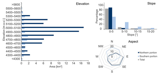 The elevation distribution of all aufeis-covered areas ranged from 4250–5600 m a.s.l. (Figure 6). In total, 53% of these areas were located between 4800 m a.s.l. and 5100 m a.s.l., with a slight increase in elevation towards the north. Thus, in the northern portion, 34 km2 of the area covered by aufeis was located in the elevation range 4900–5100 m a.s.l., while in the southern portion, most of the aufeis was located between 4700 m a.s.l. and 4900 m a.s.l. Accordingly, the average elevation in the northern portion is almost 100 m higher than in the southern portion, where the average elevation is 4860 m a.s.l. Giant aufeis fields are restricted to the elevation range 4800–5100 m a.s.l.