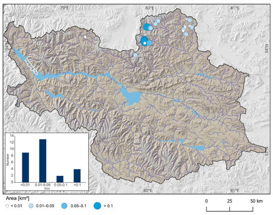 Spatial distribution and size of aufeis fields in the study area of Pangong Tso Basin (PTB) in spring 2019.