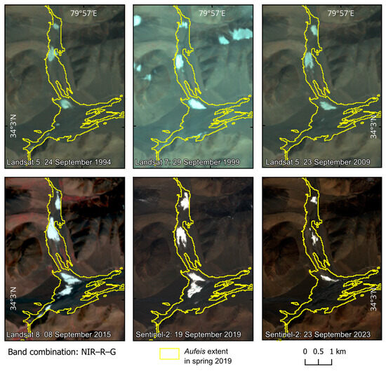 To further analyze the potential persistence of individual aufeis fields over the recent decades, Landsat imagery was integrated as an additional data source, as it is the only available satellite data that can be used for comparison with high spatial resolution over decadal observations. However, cloud cover and partial data gaps due to ground station malfunction over the HMA limited the suitable time intervals [32]. Therefore, four Landsat datasets from September 1994, 1999, 2009, and 2015 and Sentinel-2 images from 2023 were selected.