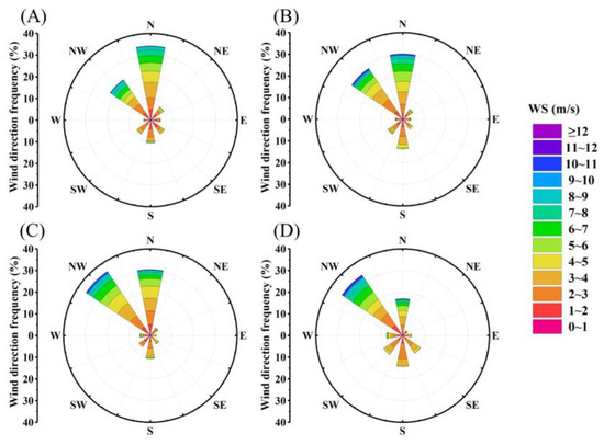 Wind rose diagram in DECA 1.0 (A), DECA 2.0 (B), IMO 2020 (C), and Pre-OWG Beijing 2022 (D).