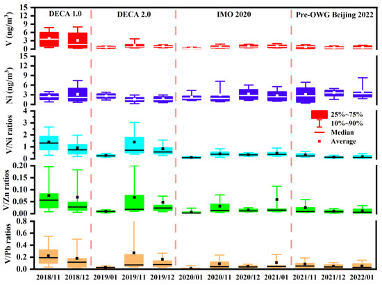 The V/Pb ratios of DECA 1.0, DECA 2.0, IMO 2020, and Pre-OWG Beijing 2022 were 0.20 ± 0.20, 0.19 ± 0.37, 0.07 ± 0.12, and 0.02 ± 0.03 ng/m3, respectively. The V/Pb ratios in the DECA 1.0 and DECA 2.0 stages were higher than those observed by [32] (0.11–0.27 ng/m3, PM2.5). Compared with the IMO 2020 stage, the Pre-OWG Beijing 2022 stage dropped by 71.4% due to the stringent control and emission reduction in industrial enterprises in BTH and surrounding cities during the preparatory stage for the Winter Olympics.