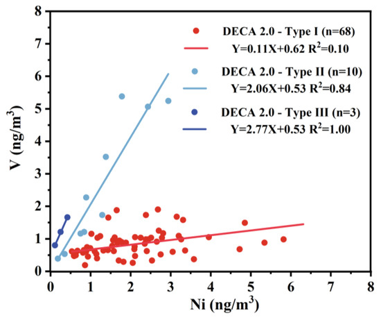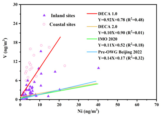 Alongside this, the contribution of inland transportation to V and Ni gradually increased. Based on the multiple linear regression model, the DECA 1.0 phase showed a better fit using V as a tracer for ship emission sources to ambient SO2. After the DECA 2.0 stage, the fitting coefficients for V as a shipping source could be ignored due to the influence of other emission sources.