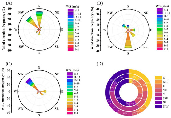 Wind rose under Types I (A), Types II (B), Types III (C), and annular wind frequency (D) in the DECA 2.0 stage. Outer circle: Type I. Middle circle: Type II. Inner circle: Type III.
