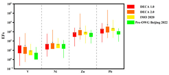 Based on the results of EFs, the uncertainty of the V, Ni, and V/Ni ratio in ship source traceability after implementing the DECA 2.0 policy was further confirmed as the ship source traceability standard. Pb and Zn had EFs above 500 under different policies, indicating the influence of anthropogenic sources (Figure 7). In the DECA 1.0, DECA 2.0, IMO 2020, and Pre-OWG Beijing 2022 stages, the EFs of V were 30.0, 32.6, 8.46, and 4.18; the EFs of Ni were 45.0, 71.2, 41.2, and 32.7, respectively. Before the IMO 2020 stage, V and Ni were more affected by anthropogenic sources, consistent with the results in Jingtang Port in Tangshan [20]. Compared with the DECA 1.0 stage, the V concentration in the Pre-OWG Beijing 2022 stage decreased by 86.1%. After the implementation of IMO 2020, the source of V was affected by both anthropogenic and natural sources.
