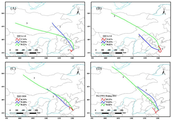 Trajectory of 48 h airflow in DECA 1.0 (A), DECA 2.0 (B), IMO 2020 (C), and Pre-OWG Beijing 2022 (D).