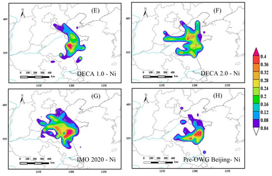 The PSCF results showed that V might distributed in Qingdao and the surrounding coastal areas in the DECA 1.0 stage. Coastal cities such as Tianjin, Yantai, and Rizhao had higher V and similar potential emission source areas to Ni (Figure 9A,E). The potential emission source area of V reduced in the DECA 2.0 stage, mainly distributed in Qingdao and its coastal regions (Figure 9B). The potential emission areas of V and Ni in the IMO 2020 stage were widely distributed in inland areas (Figure 9C,G). The potential emission area of the Pre-OWG Beijing 2022 stage was significantly reduced, mainly concentrated in Qingdao (Figure 9D,H), though V and Ni were still high in several inland cities. A series of stringent control measures were implemented in BTH and surrounding areas to ensure air quality improvement before and during the Beijing Winter Olympics, which might have significantly reduced the potential emission areas of SO2, V, and Ni (Figure S9).