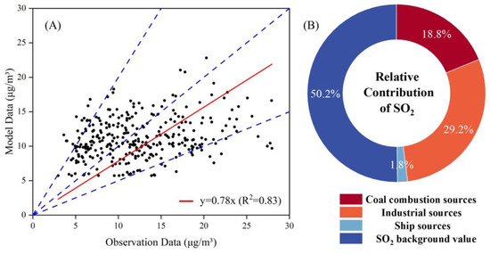 Linear regression of SO2 simulated values on observed values (A) and relative contribution of each source to SO2 (B) during the DECA 1.0 stage.