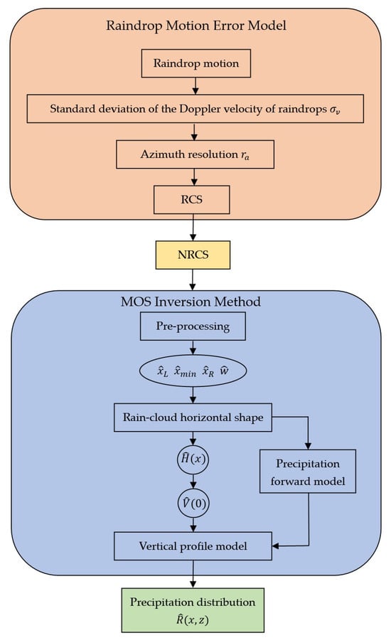 The RMM algorithm merges the proposed raindrop motion error model with the MOS inversion algorithm, enabling a quantitative evaluation of the impact of raindrop motion on the accuracy of MOS. The overall RMM algorithm is schematically shown in Figure 3, and each step is illustrated in the following.