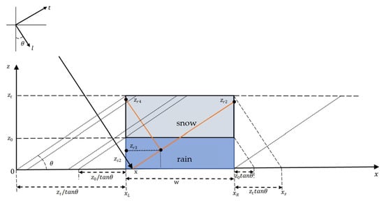 where and and and are, respectively, the upper and lower attenuation limits of backscattering echoes from the surface and the volume resolution cell. and are the upper and lower limits of the resolution cell in the rainfall area. is the top height of the rain layer, and is the top height of the snow layer. The rain cloud width extends from the left corner to the right corner .