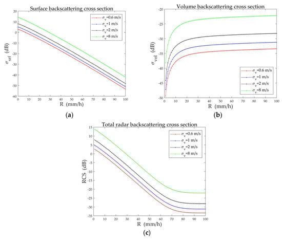 In case 1, we set = 514 km, = 3.1 cm, = −7 dB, = 13 km, = 30°, and = 7300 m/s. The precipitation rate varies from 0 to 100 mm/h, and the standard deviation of the Doppler velocity spectrum of raindrops takes values of 0.6 m/s, 1.0 m/s, 2.0 m/s, and 8.0 m/s, respectively. Using Equations (16), (22), and (23), the simulated curves of the surface backscattering cross section , the volume backscattering cross section , and the total radar backscattering cross section with varying and are shown in Figure 5.