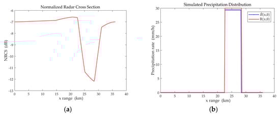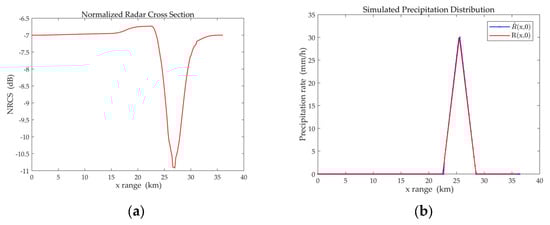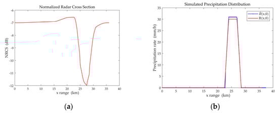 Case 2: Taking a rectangular rain cloud ( = 0 km), the surface rain rate is 30 mm/h. The NRCS data and the inversion results are shown in Figure 6. The surface rain rate retrieved by RMM of = 1 m/s is 29.36 mm/h.