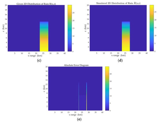 Figure 6e shows the absolute error between the retrieved two-dimensional precipitation distribution and the given two-dimensional precipitation distribution . More significant absolute errors occur at the edges of the rainfall area. This is mainly because of the error in the retrieved rainfall area width . Furthermore, the MOS can be applied to rain clouds of various shapes, as shown in Figure 6, Figure 7 and Figure 8. This method can also be applied to various rainfall rates, as shown in Figure 9 and Figure 10. The above results prove that the retrieval results using the MOS are in good agreement with the given rain cloud model in windless conditions, where the impact of raindrop motion error is negligible.