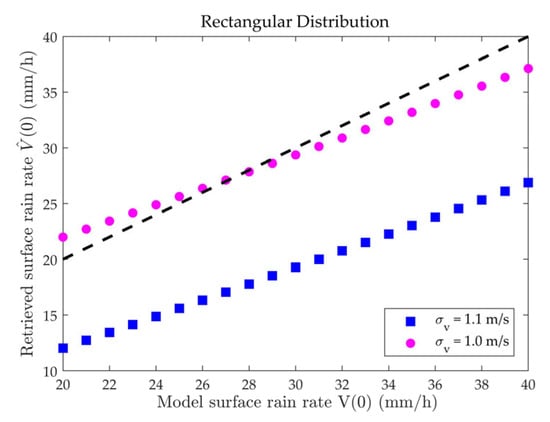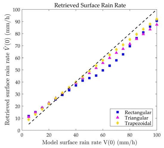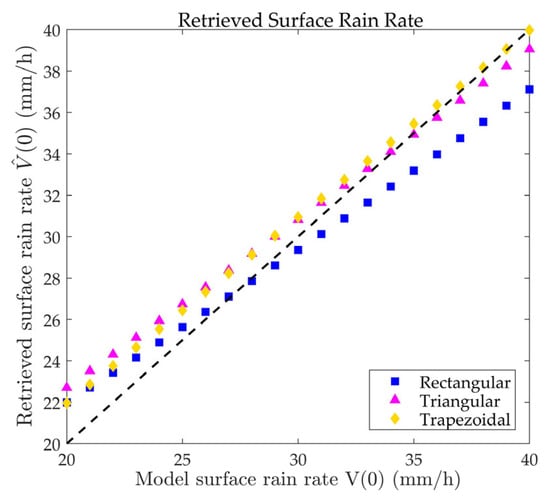 Case 3: Taking a trapezoidal rain cloud ( = 1.5 km), the surface rain rate is 30 mm/h. The inversion results are shown in Figure 7. The surface rain rate retrieved by RMM of = 1 m/s is 30.94 mm/h.