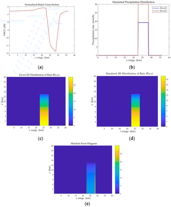 Inversion results under rectangular horizontal distribution by RMM of = 1 m/s. (a) The normalized radar cross section; (b) Simulated precipitation distribution ; (c) Given precipitation distribution ; (d) Simulated precipitation distribution ; (e) Absolute error diagram.