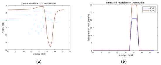 where is the x-axis position corresponding to the minimum . The values 1.13, 21.62, 2.58, and 23.3 are all empirical values, only applicable to rain clouds with = 30°, = 13 km, and = 4.5 km. If the height of the rain cloud or the incidence angle of X-SAR changes, all the empirical values mentioned above need to be recalculated, which will require a large amount of weather data as assistance [40].