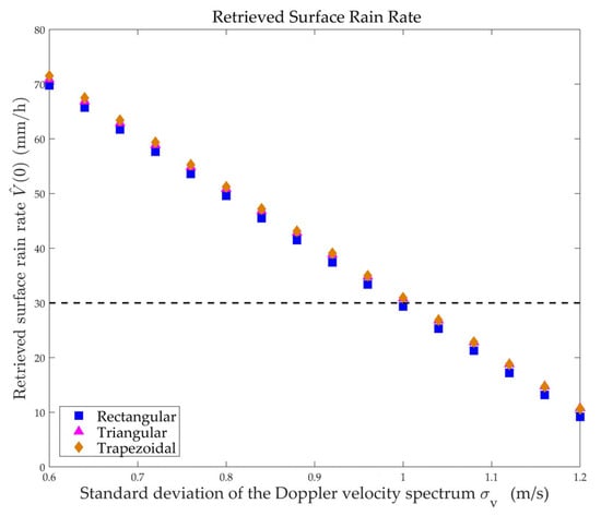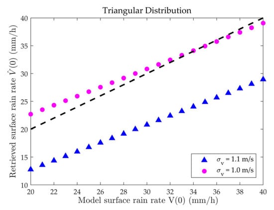Case 4: Taking a triangular rain cloud ( = 3 km), the surface rain rate is 30 mm/h. The inversion results are shown in Figure 8. The surface rain rate retrieved by RMM of = 1 m/s is 30.82 mm/h.