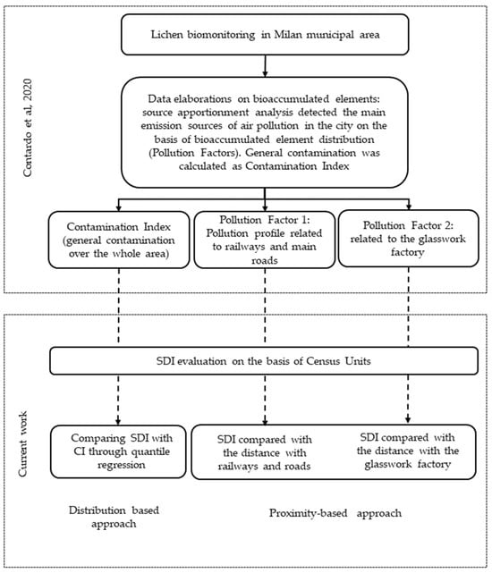 Figure shows the workflow of the work. Lichen biomonitoring was carried out in the city of Milan by [] disentangling the main emission source of air pollution. This study focuses on the even distribution of environmental benefits and hazards, combining socio-economic deprivation and the results of the lichen biomonitoring study already carried out.
