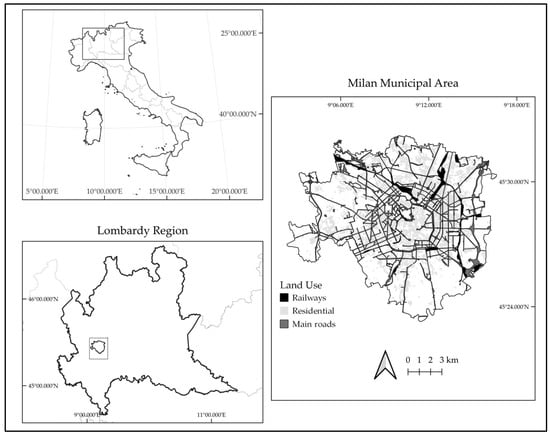 Study area. On the left, we depict Italy and the details of the Lombardy Region. On the right, we provide the particulars of Milan municipality with main roads, railways, and residential land use in evidence.