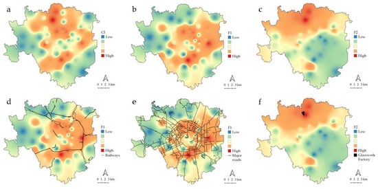 Milan municipality is represented with the spatial elaboration of Pollution Factors and Contamination Index from []. Spatial distribution of the Factors and the CI were elaborated through deterministic method of Inverse Distance Weighting (IDW) on the basis of the bioaccumulated PTEs. (a) Contamination Index, (b) Factor 1: main roads and railways, (c) Factor 2: glasswork, (d) railway lines, (e) network of main roads of Milan, (f) location of the glasswork factory. Figures from [], with permission.